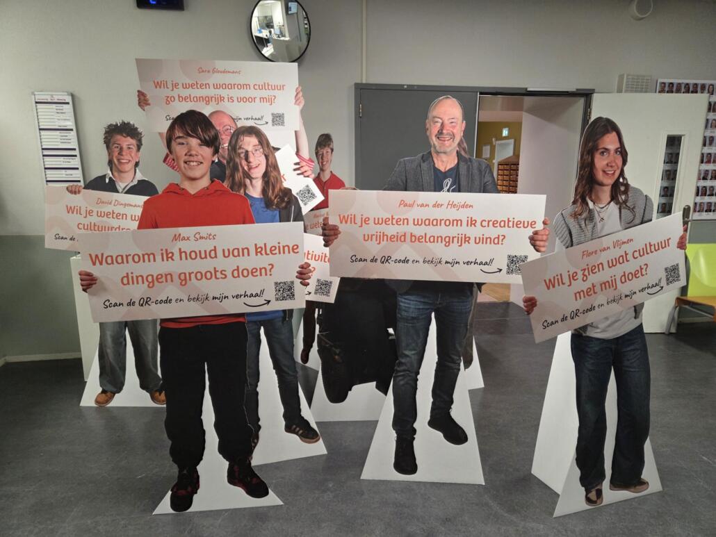 Omdat leerlingen en docenten van het TBL het allerbeste zélf kunnen vertellen wat kunst en cultuur voor hen betekenen, zijn er video’s opgenomen. Paul van der Heijden: ‘Door de hele school stonden borden met levensgrote foto’s van leerlingen en docenten. Via een QR-code kon je hun filmpjes bekijken. Wat de leerlingen vertelden over de waarde en kracht van kunst en cultuur voor hen, maakte een diepe indruk op mij.’ De video’s zorgden er tijdens de design thinking gesprekrondes ook voor dat de deelnemers zich goed konden verplaatsen in leerlingen en docenten. Ze zorgden voor inspiratie en gaven een inkijkje in wat kunst en cultuur doen voor leerlingen, docenten en de school. Op de vraag wat de waarde is van kunst- en cultuuronderwijs reageerde Lindy Croonen, teamleider: ‘Niet alle kinderen komen uit een omgeving waar creativiteit wordt gestimuleerd. Het is goed dat het hier op school wordt aangeboden, het kan ook rust en ontspanning geven.’